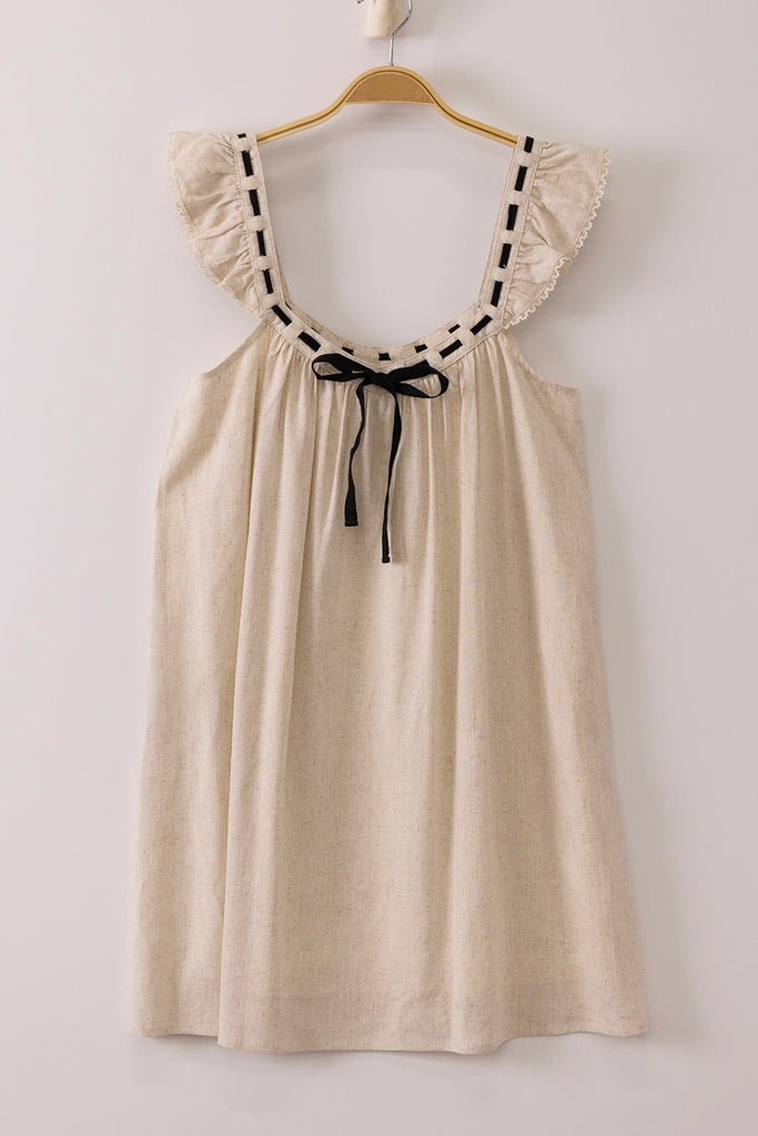 cotton/linen blend mini dress with square neckline, ruffle sleeves, and ribbon detail. 70% cotton, 30% linen
