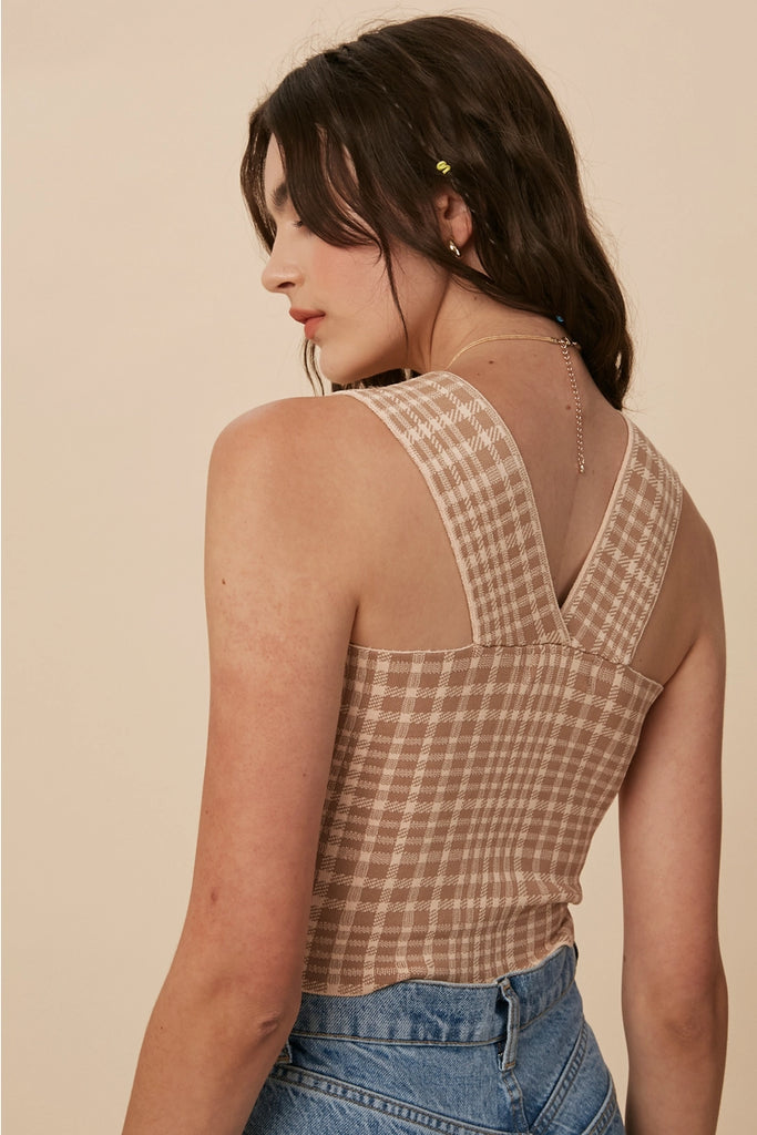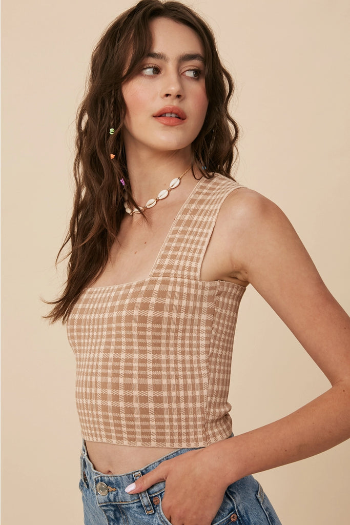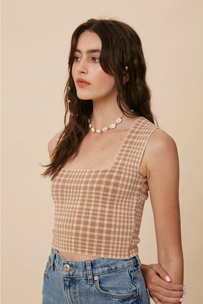 plaid knit tank in soft stretch fabric with sophisticated square neckline. a must have layering piece